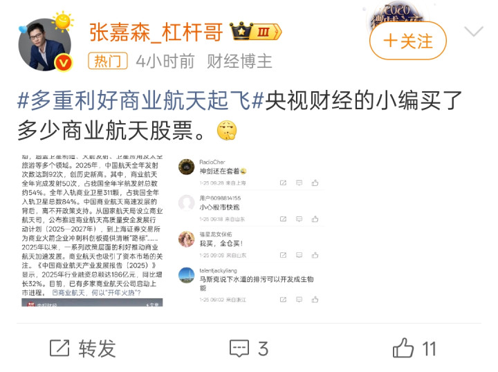 连农村从不炒股的亲戚都来问我“能不能买航天股票”了,说明热度已经到顶了,大概率要跌了。