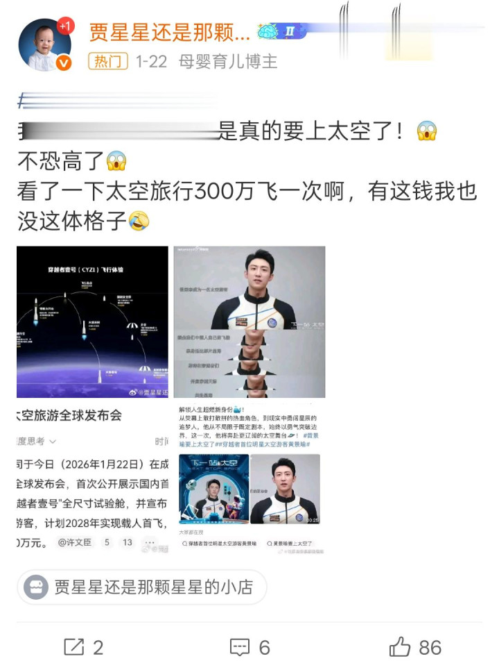 最近很火的一个消息是,黄景瑜要去太空旅行了,瞬间点燃了人们对商业太空旅行的热情。